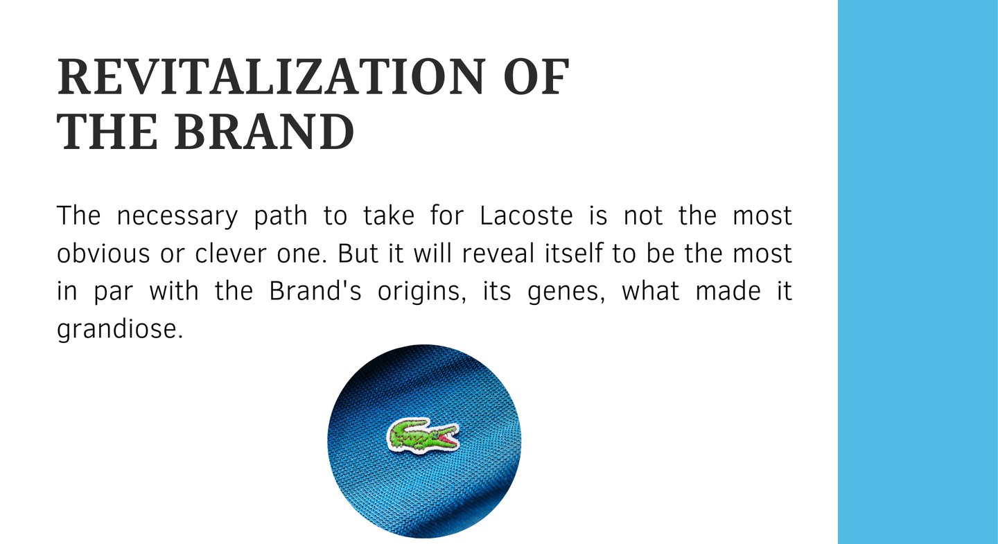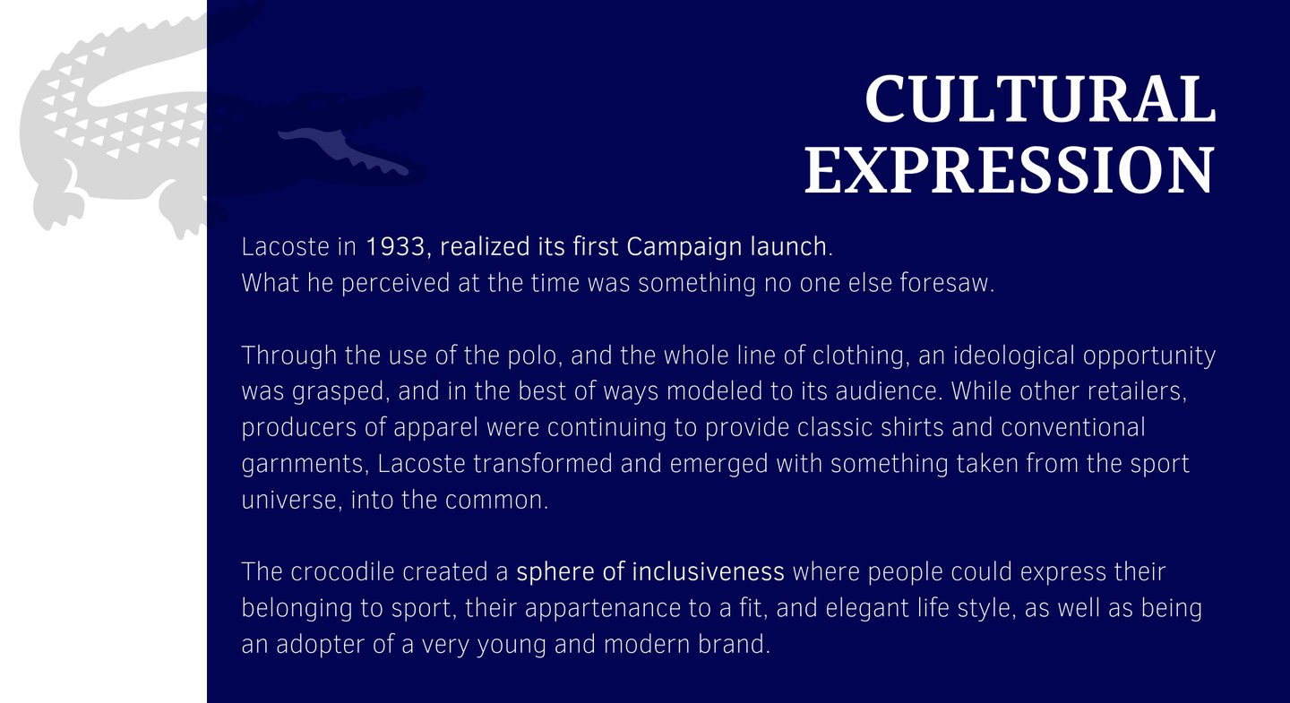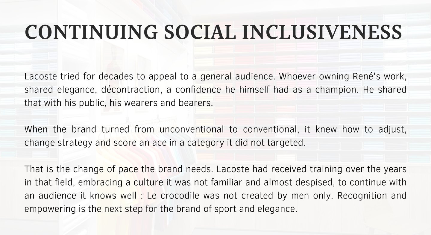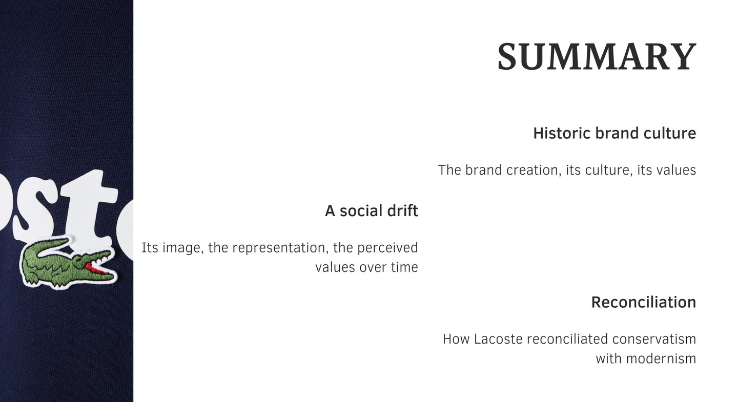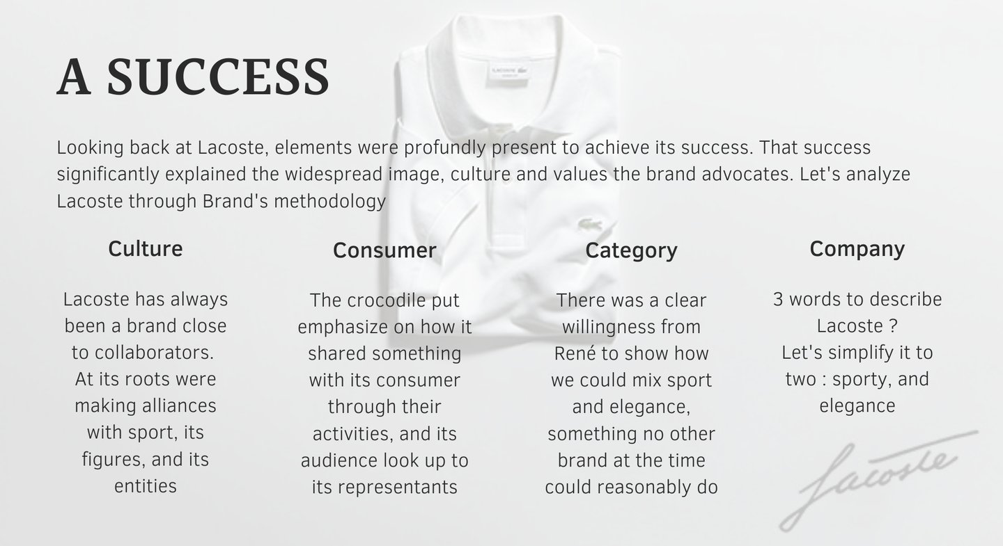 De réussite à échec, de rebond en rebond, la marque au crocodile a su marquer les bons points, gardant en héritage ses valeurs et sa culture du sport, tout en conciliant une image et des représentations ayant changé à travers le temps.