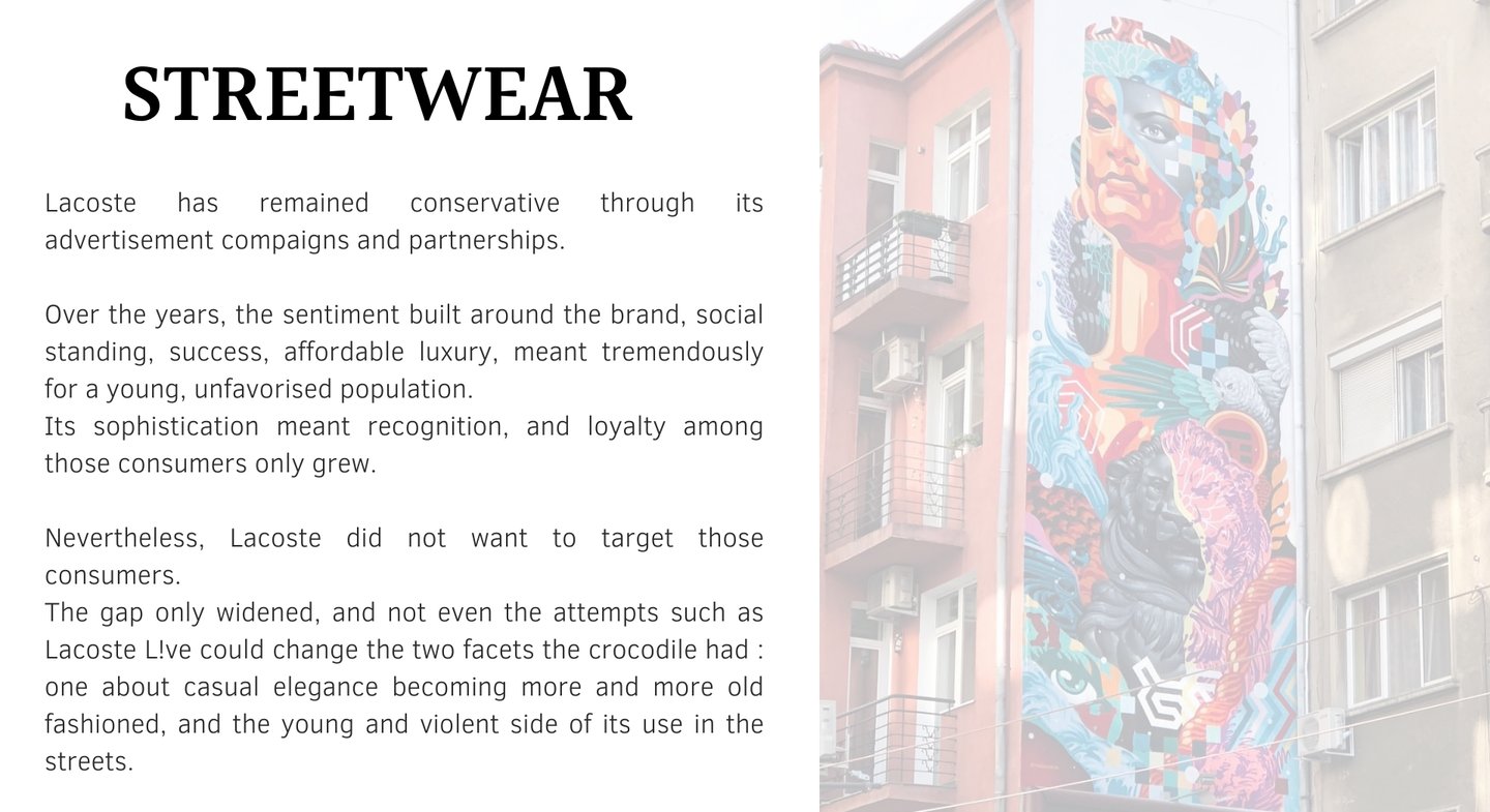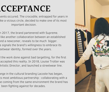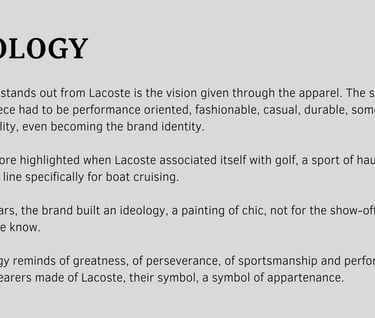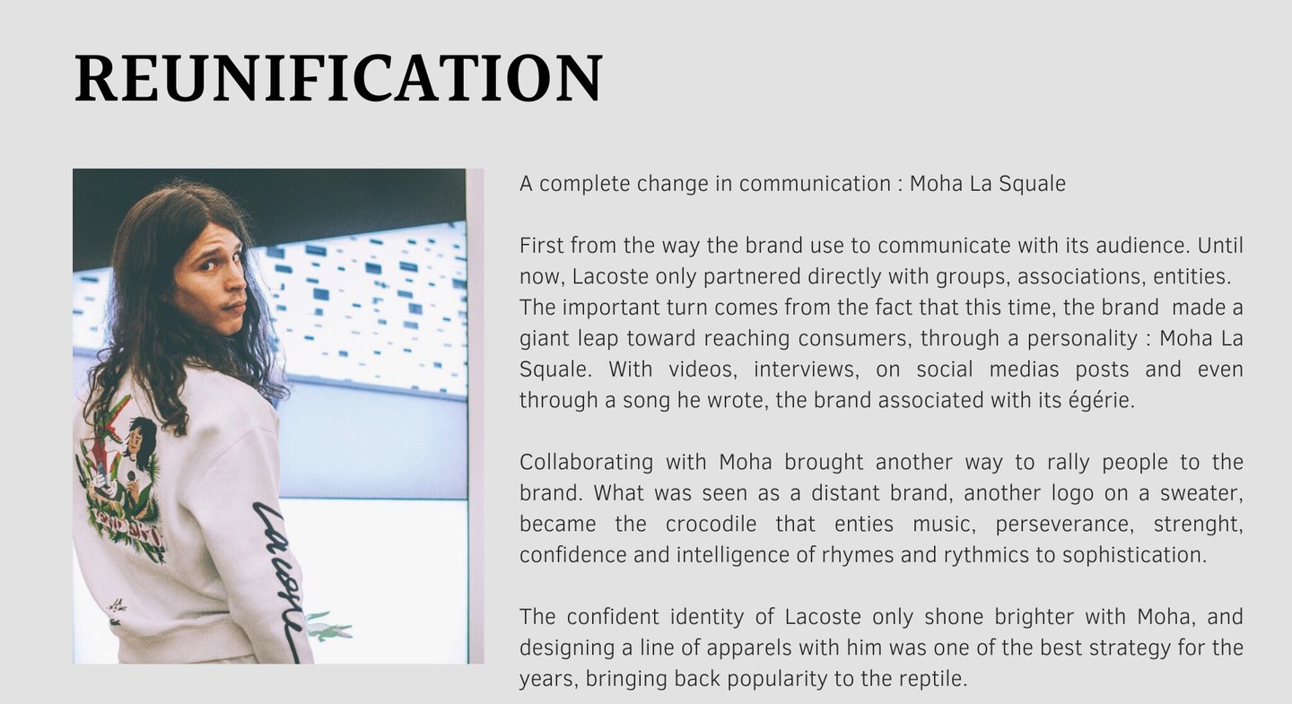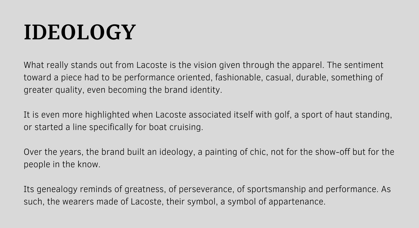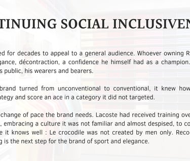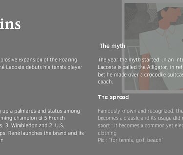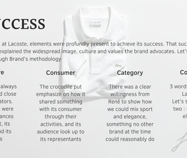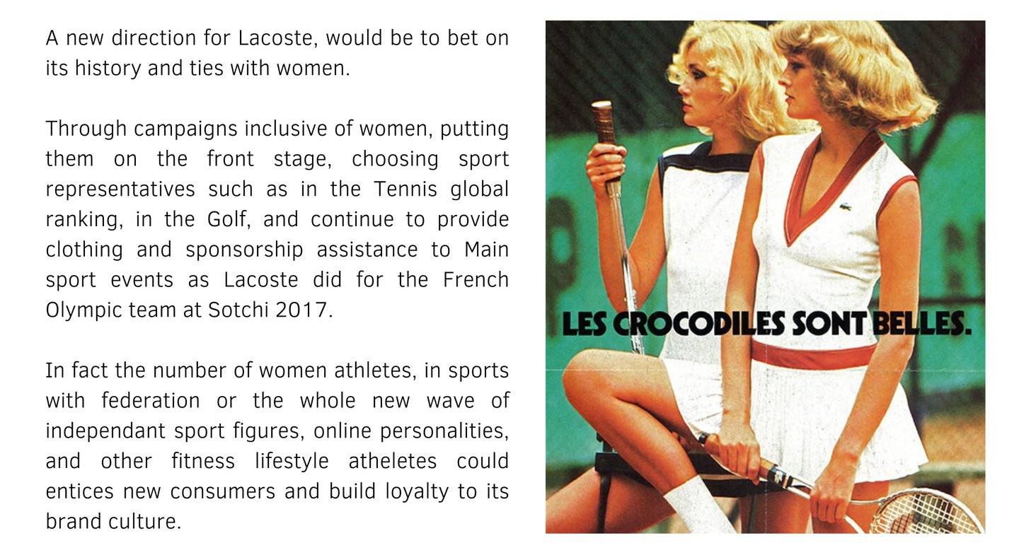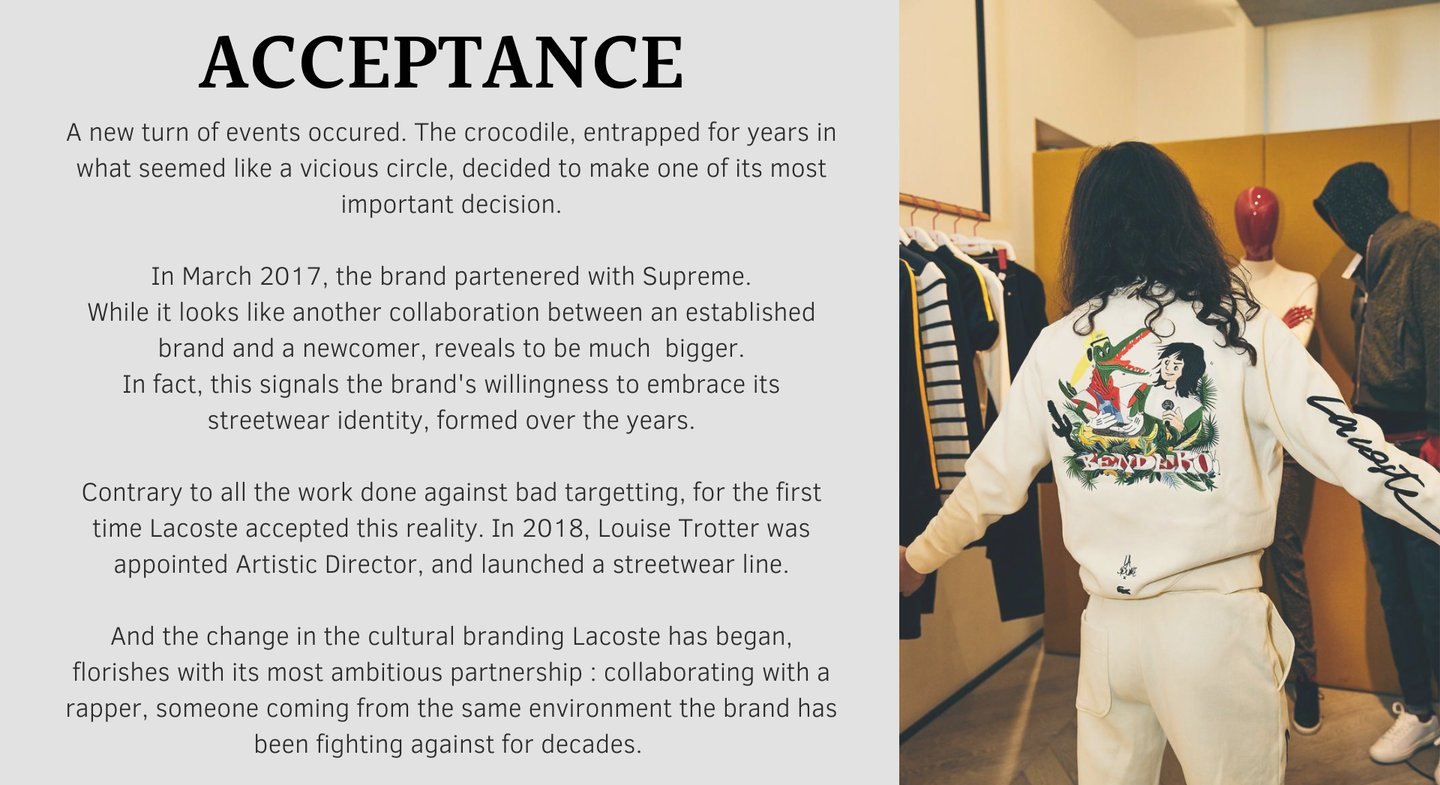 De réussite à échec, de rebond en rebond, la marque au crocodile a su marquer les bons points, gardant en héritage ses valeurs et sa culture du sport, tout en conciliant une image et des représentations ayant changé à travers le temps.