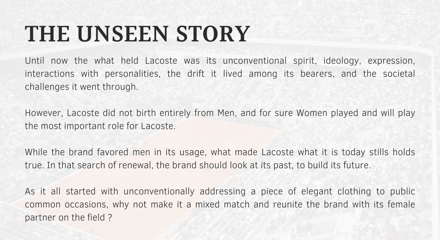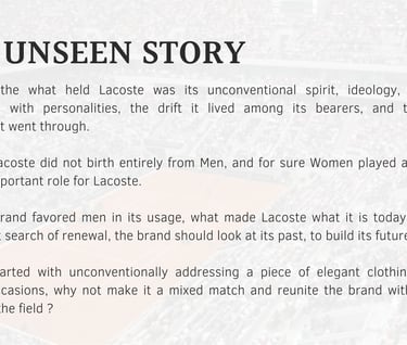 La marque Lacoste, depuis ses débuts jusqu'aujourd'hui, n'a pas vécu une histoire de tout repos. Au contraire, celle-ci, tout comme le sport dont elle provient, est mouvementée et dynamique.