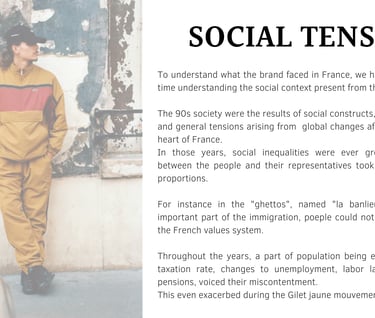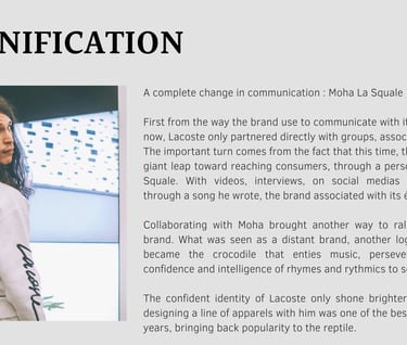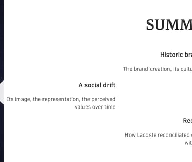 Malgré une forme et des codes très différents selon les diapo, le fond reste centré sur l'image de marque, la représentation changeante perçue par ses consommateurs, et les difficultés de la marque à concilier héritage et modernité.